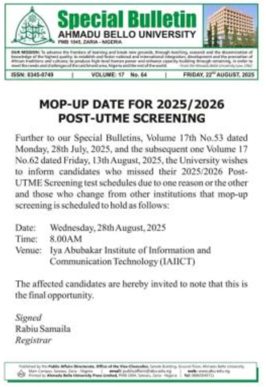 ABU Zaria Post-UTME Mop-Up Screening, 2025/2026