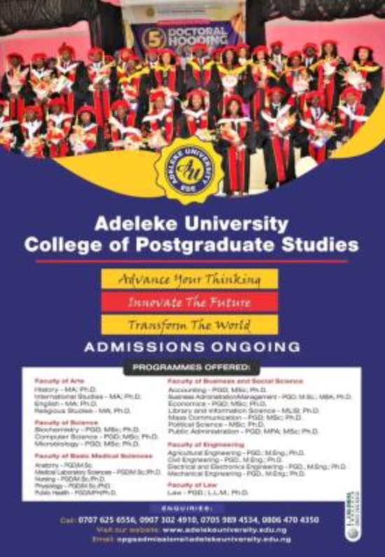 The management of Adeleke University, Ede, through its College of Postgraduate Studies, invites applications from suitably qualified candidates for admission into various postgraduate programmes for the 2025/2026 academic session.