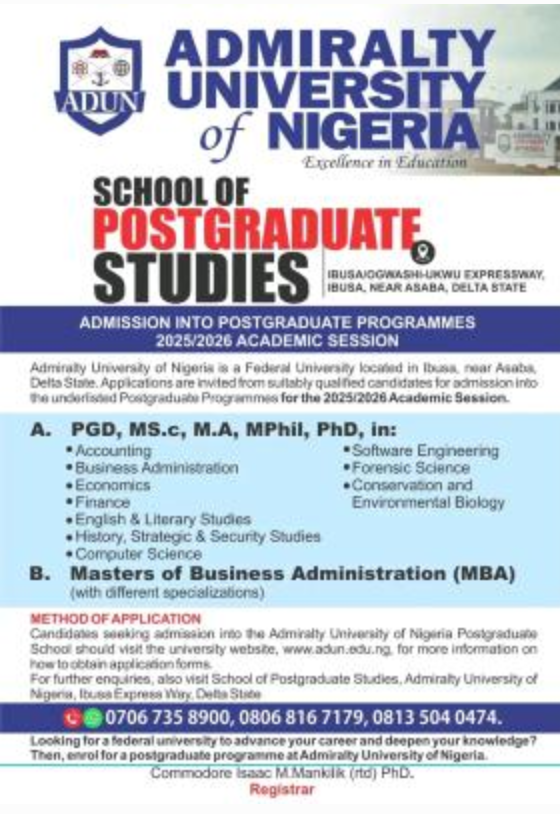 Admiralty University of Nigeria (ADUN) is pleased to announce the commencement of its Postgraduate Admission for the 2025/2026 academic session.