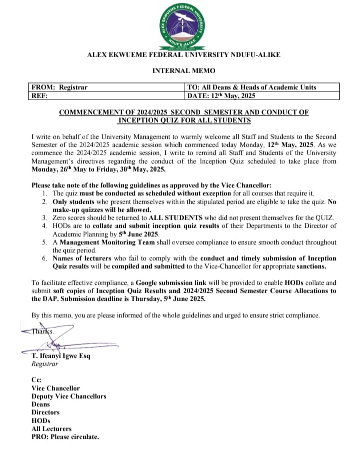 Alex Ekwueme Federal University, Ndufu-Alike (AE-FUNAI) has released official guidelines for the conduct of the 2024/2025 second semester Inception Quiz. According to a memo from the Registrar, T. Ifeanyi Igwe, the quiz will run from Monday, 26th May to Friday, 30th May 2025.