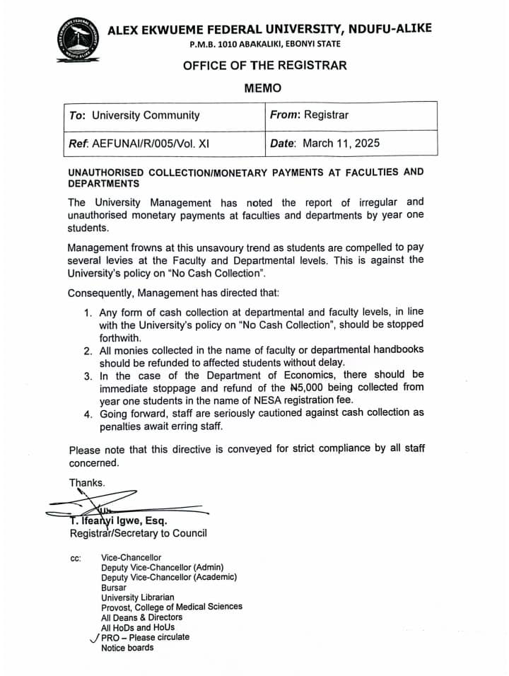The management of Alex Ekwueme Federal University, Ndufu-Alike (AE-FUNAI) has issued a strong directive prohibiting unauthorized monetary payments at faculties and departments, particularly targeting levies imposed on first-year students.