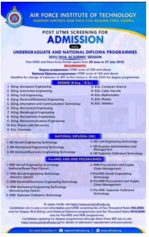 The Air Force Institute of Technology (AFIT), Kaduna has opened its application portal for Post-UTME and Direct Entry (DE) screening for the 2025/2026 academic session.