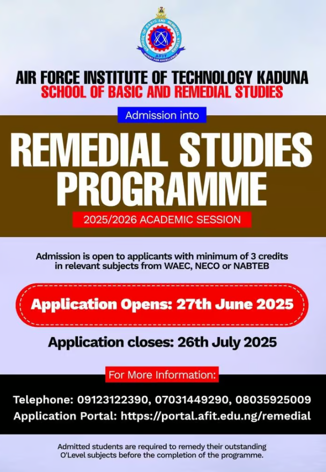 The Air Force Institute of Technology (AFIT), Kaduna, is now accepting applications for its Remedial Programme for the 2025/2026 academic session. This is a second chance for candidates who didn’t meet the JAMB cut-off or have O’level deficiencies.