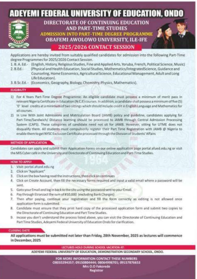 Adeyemi Federal University of Education (AFUED), Ondo, invites applications from suitably qualified candidates for admission into its Part-Time Degree Programmes for the 2025/2026 academic session.