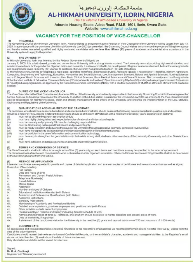 Al-Hikmah University, Ilorin, will have a vacancy for the position of Vice-Chancellor from 13th July 2025. The school’s Governing Council has opened up the selection process and is inviting interested and qualified Professors to apply.