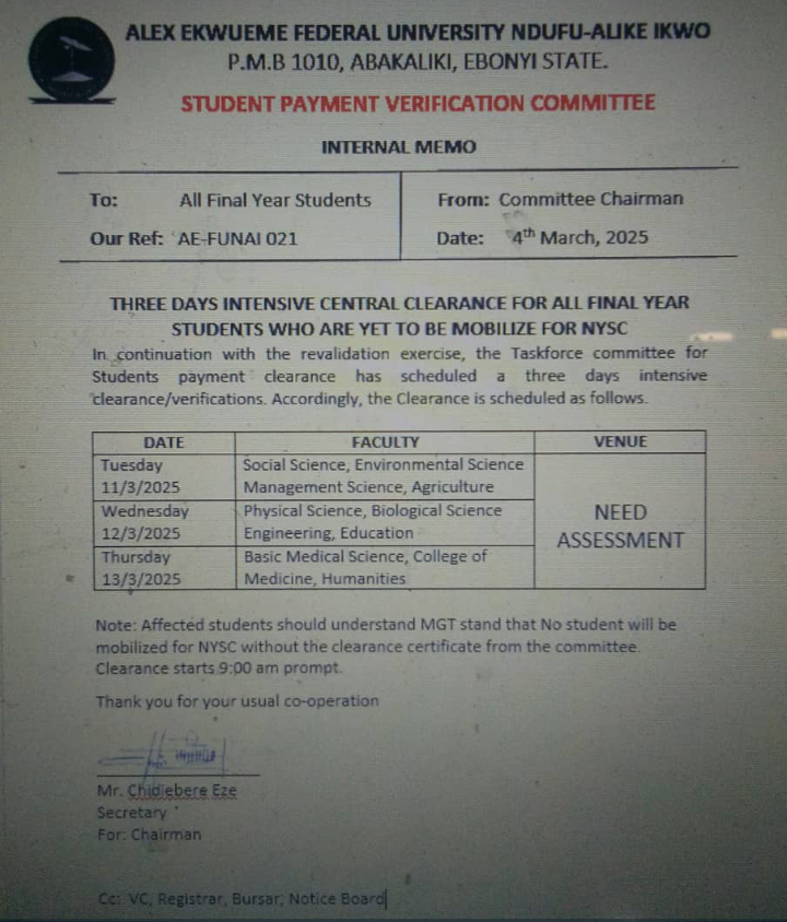 The Student Payment Verification Committee of Alex Ekwueme Federal University Ndufu-Alike Ikwo (AE-FUNAI) has issued an internal memo announcing a three-day intensive central clearance for final-year students who are yet to be mobilized for the National Youth Service Corps (NYSC).
