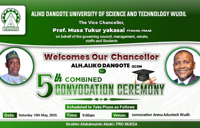 Aliko Dangote University of Science and Technology, Wudil (ADUSTECH), is set to host its 5th Combined Convocation Ceremony on Saturday, May 10, 2025. The prestigious event will be held at the Convocation Arena within the Adustech Wudil campus, starting at 9:00 AM.