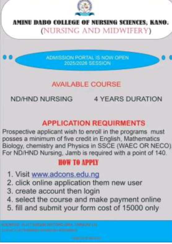 Applications are invited from suitably qualified candidates for admission into the National Diploma (ND) and Higher National Diploma (HND) Nursing programmes at Aminu Dabo College of Nursing Sciences, Kano, for the 2025/2026 academic session.