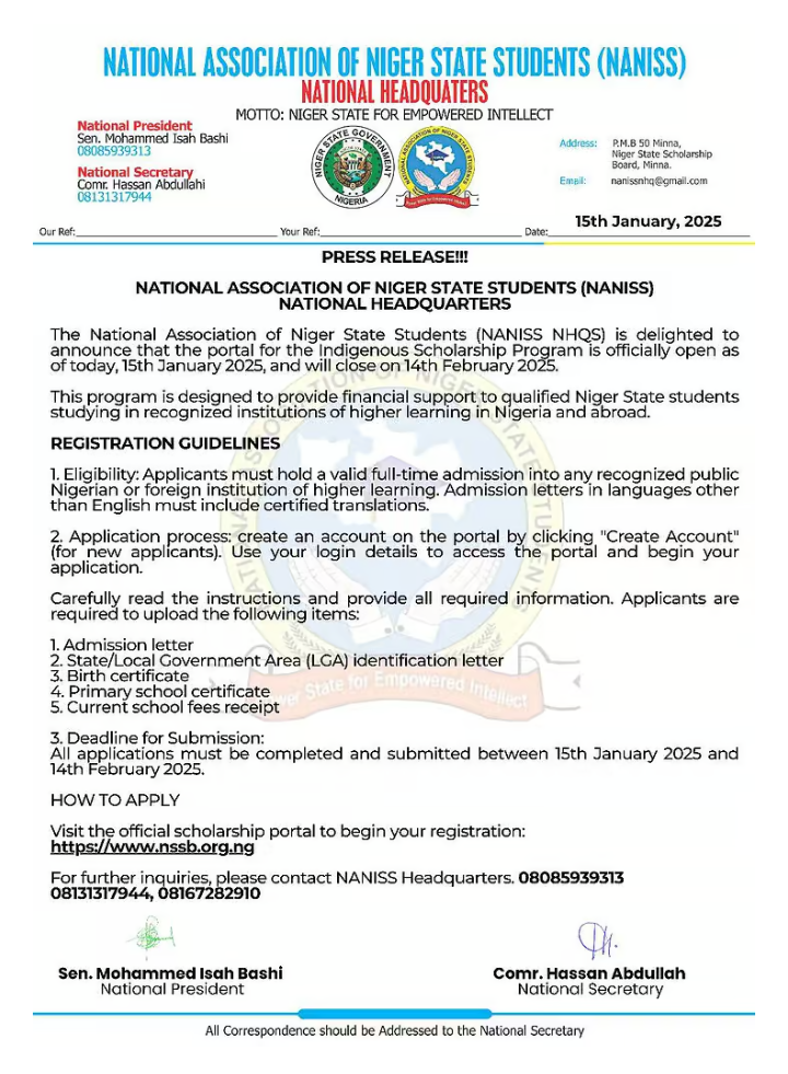 The National Association of Niger State Students (NANISS NHQS) has opened the Indigenous Scholarship Program for 2025. This program provides financial assistance to Niger State students enrolled in public institutions in Nigeria or abroad.