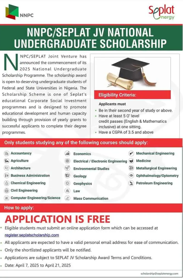 The NNPC and SEPLAT Joint Venture is offering its 2025 undergraduate scholarship to support students in federal and state universities across Nigeria.