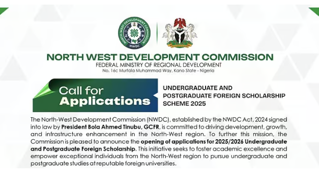 The North-West Development Commission (NWDC) is offering fully-funded foreign scholarships for 2025/2026 to students from the North-West states of Nigeria. Submit your application before 18 May 2025.
