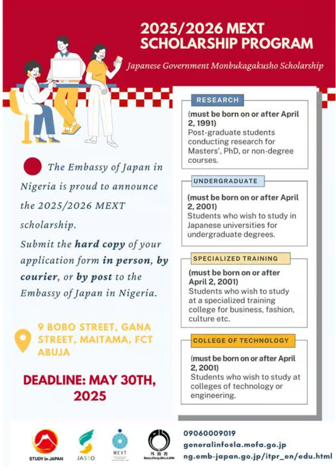 Are you a Nigerian student hoping to study in Japan for free? The MEXT Scholarship 2026 offers full funding for undergraduate, masterโs, PhD, and technical studies.