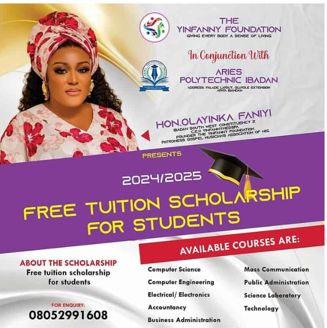 The Yinfanny Foundation, in collaboration with Aries Polytechnic Ibadan, is offering a Free Tuition Scholarship for the 2024/2025 academic session.