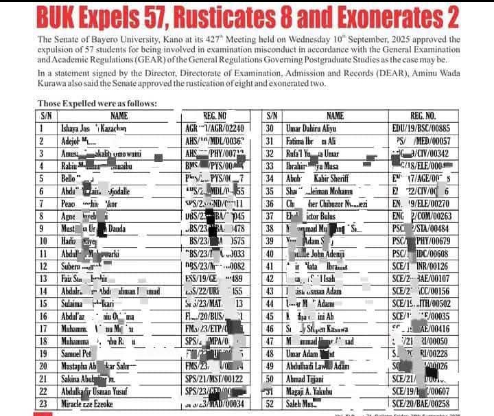 In a significant disciplinary move, the Senate of Bayero University, Kano (BUK), has approved the expulsion of 57 students for their involvement in examination malpractice. The decision was reached during the Senate’s 427th meeting held on Wednesday, 10th September 2025, based on findings from investigations conducted in line with the General Examination and Academic Regulations (GEAR).