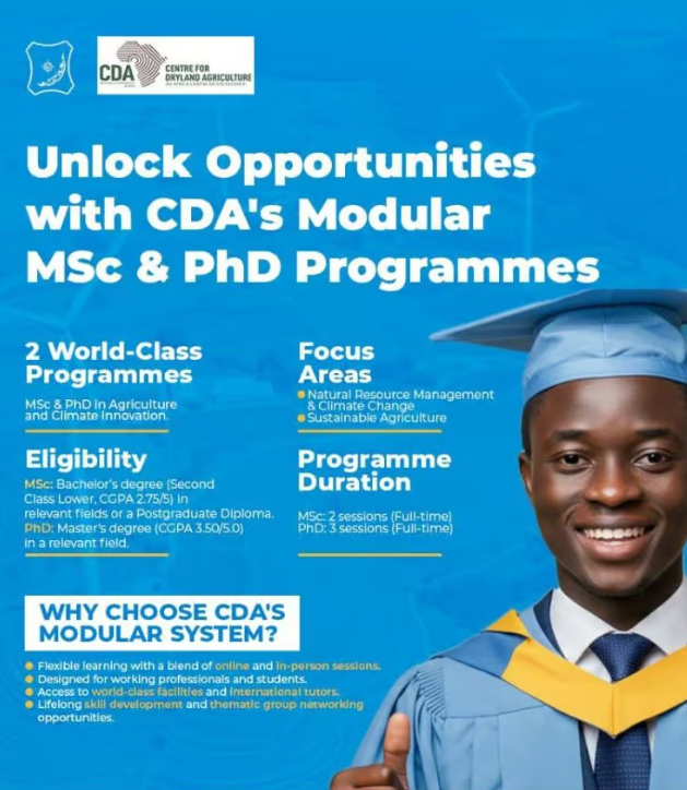 Bayero University Kano (BUK), through its Centre for Dryland Agriculture (CDA), is inviting applications for its 2025 Modular MSc and PhD programmes focused on Agriculture and Climate. These flexible postgraduate courses are ideal for professionals working in sustainable farming, climate response, and environmental resource management.