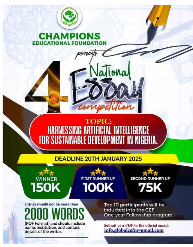 The Champions Educational Foundation (CEF) invites students to participate in an essay competition on Artificial Intelligence (AI) and sustainable development in Nigeria. This post highlights the theme, submission guidelines, prizes, and deadlines.