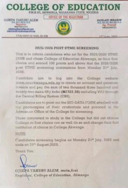 The College of Education, Akwanga has announced the commencement of its Post-UTME screening for the 2025/2026 academic session.
