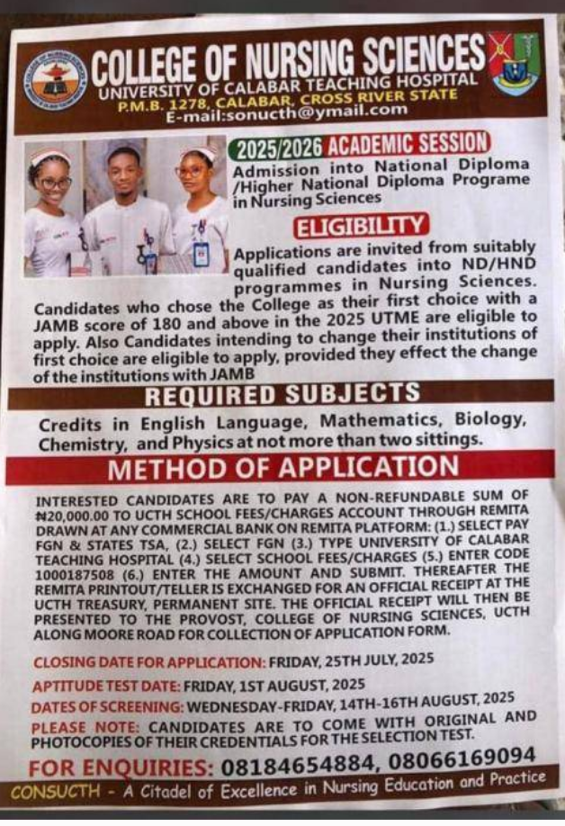 The College of Nursing Sciences, University of Calabar Teaching Hospital (UCTH), invites applications from suitably qualified candidates for admission into its ND and HND Nursing Sciences programmes for the 2025/2026 academic session.