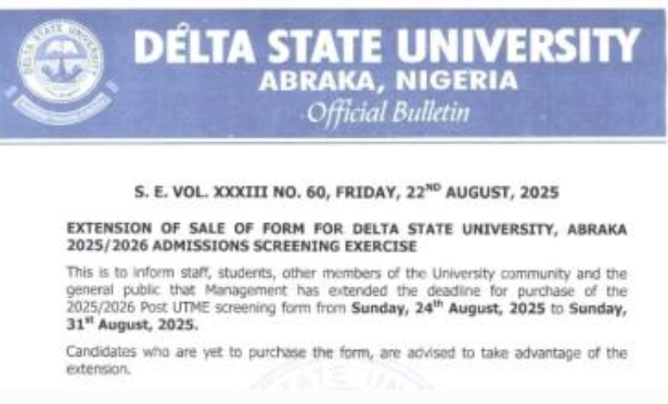 This is to inform staff, students, prospective candidates, and the general public that the Management of Delta State University (DELSU), Abraka, has approved an extension of the deadline for the purchase of the 2025/2026 Post-UTME screening form.