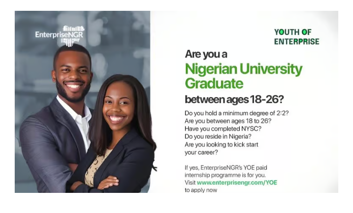 EnterpriseNGR is now accepting applications for Cohort 6 of its Youth of Enterprise (YOE) Internship Programme – a six-month paid internship designed to help young Nigerian graduates gain valuable skills and workplace experience.