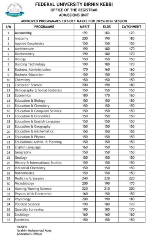 This is to inform the general public, especially prospective candidates, that the management of the Federal University of Biomedical Sciences, Kwale (FBUK), has released the approved admission cut-off marks for various departments for the 2025/2026 academic session.