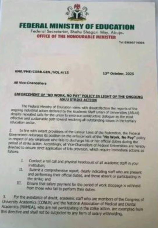 The Federal Ministry of Education views with dissatisfaction the reports of the ongoing industrial action declared by the Academic Staff Union of Universities (ASUU) despite repeated calls for the union to embrace constructive dialogue as the most effective and sustainable path toward resolving all outstanding issues in the tertiary education sector.