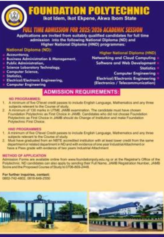 Applications are now open for admission into National Diploma (ND) and Higher National Diploma (HND) full-time programmes at Foundation Polytechnic, Ikot Ekpene, Akwa Ibom State for the 2025/2026 academic session.
