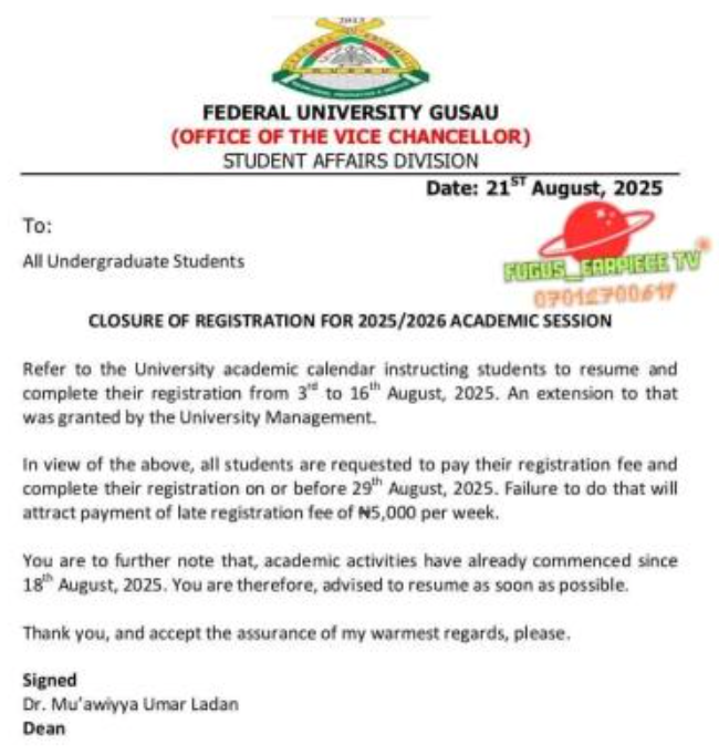 The Management of Federal University Gusau (FUGUS) wishes to remind all students that, as earlier communicated in the academic calendar, registration was scheduled to run from 3rd to 16th August, 2025. An extension was graciously granted by the University.