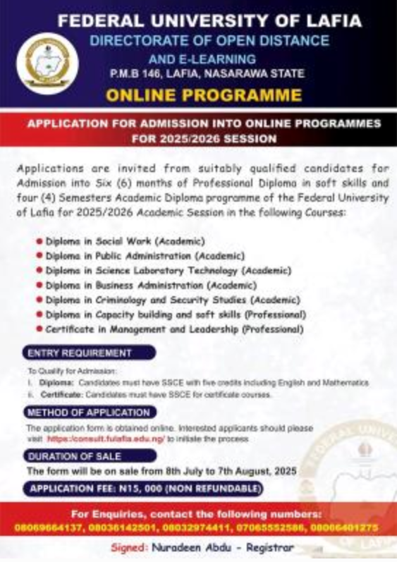 Applications are invited from suitably qualified candidates for admission into the six-month Professional Diploma in Soft Skills and four-semester Academic Diploma programmes at Federal University of Lafia (FULAFIA) for the 2025/2026 academic session.