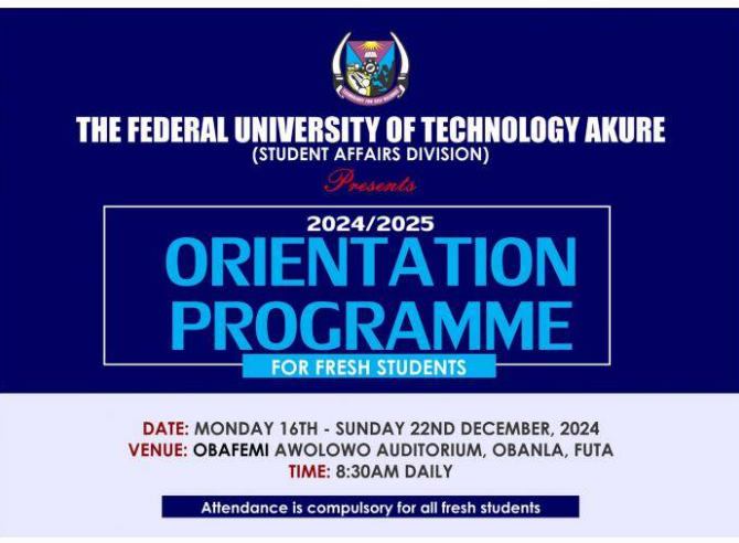 The Federal University of Technology, Akure (FUTA) has officially announced its orientation programme for fresh students admitted through UTME and Direct Entry for the 2024/2025 academic session. This event is crucial for all new students as it marks the beginning of their academic journey at FUTA.