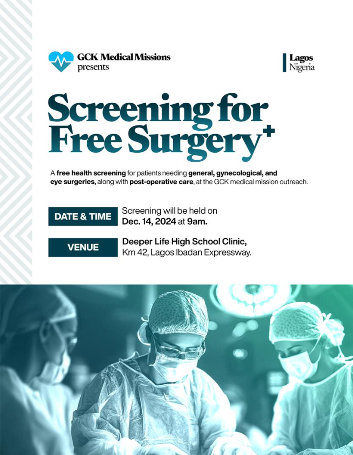 Good news for those in need of medical attention in Lagos and beyond! GCK Medical Missions has announced a free health screening event for individuals requiring general, gynecological, and eye surgeries. This remarkable initiative, which includes post-operative care, promises to bring hope and healing to many who might not have access to critical medical procedures due to financial constraints.