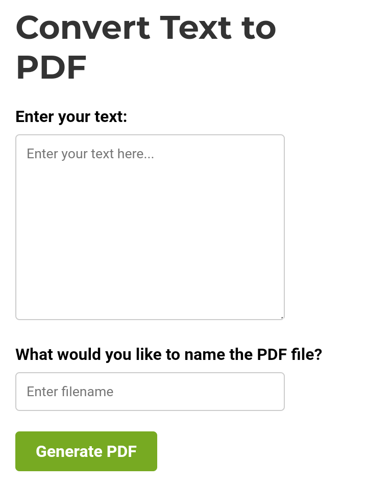 After entering your text and naming the file, click the Convert button. The tool will generate a PDF from your text, which will be downloaded.
