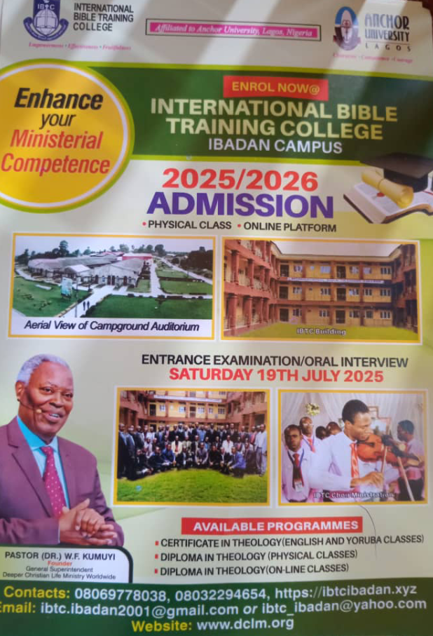 The International Bible Training College (IBTC), Ibadan Campus, affiliated with Anchor University Lagos, is now accepting applications for the 2025/2026 academic session.