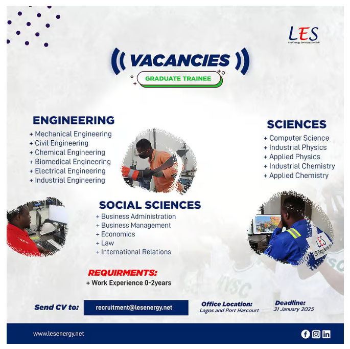 Les Energy Services Limited (LES) invites graduates to join its Graduate Trainee Program for 2025. This program offers industry knowledge, practical experience, and mentorship in Nigeria’s energy sector.