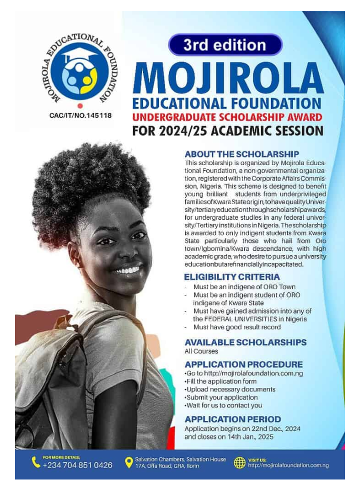 The Mojirola Educational Foundation is offering fully funded undergraduate scholarships for students from Kwara State, Nigeria.