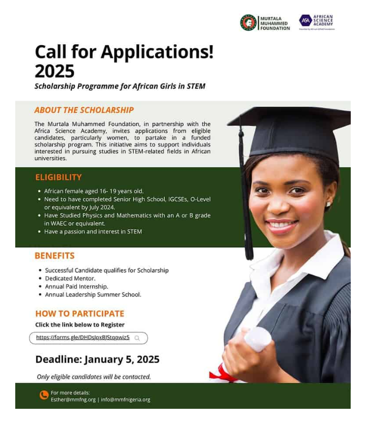 The Murtala Muhammed Foundation, in partnership with the Africa Science Academy, invites applications for its fully funded scholarship programme.