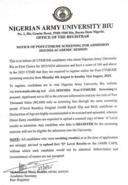 The Nigerian Army University Biu (NAUB), Borno State, invites all UTME and Direct Entry (DE) candidates who selected the university as their First Choice institution and scored 160 and above in the 2025 UTME to register online for the 2025/2026 Post-UTME/DE Screening Exercise.