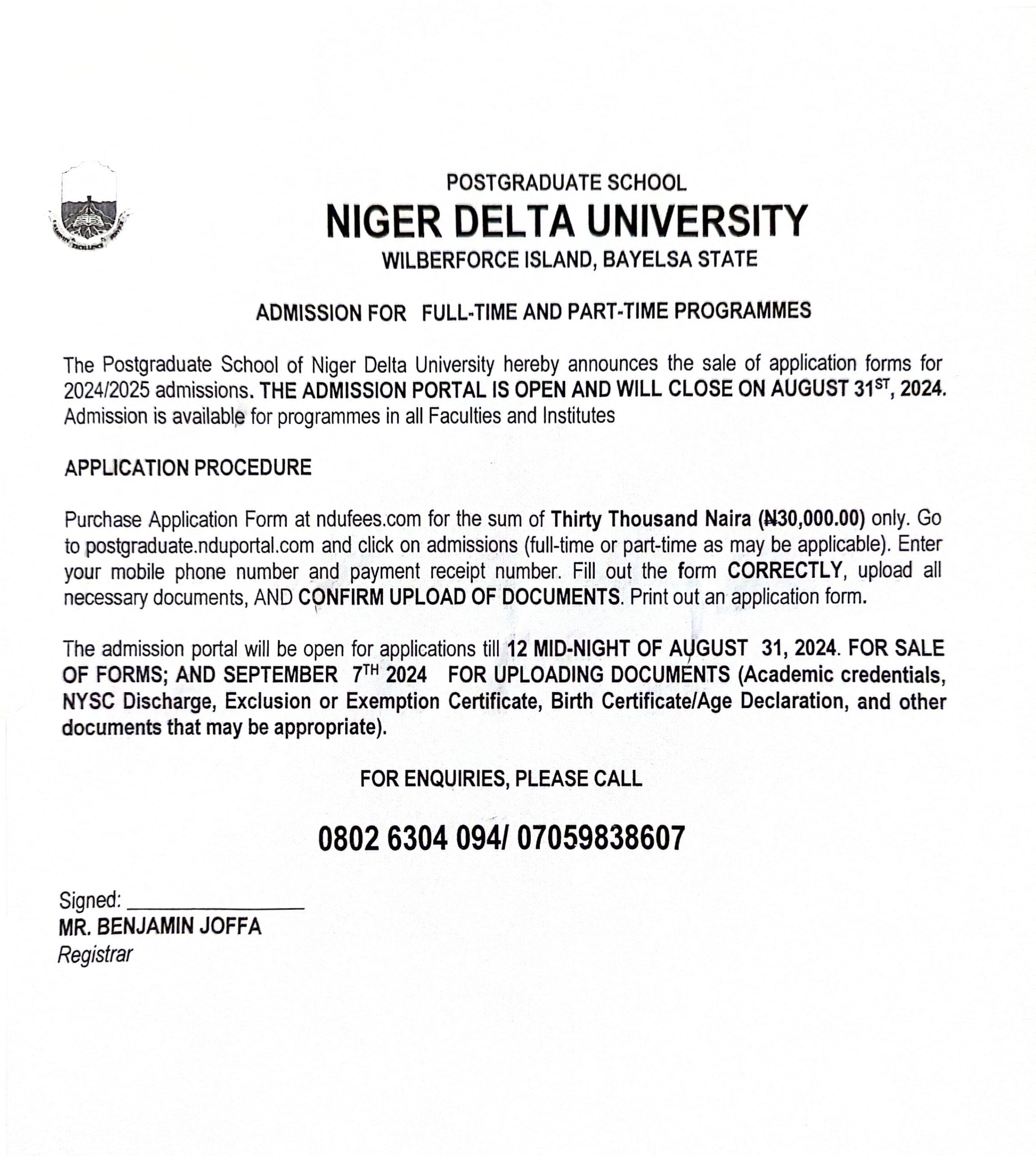 Niger Delta University Admission For Full-time And Part-time Programmes 2024 Posted 1 year ago at 7:01 am on Tuesday, July 09, 2024 by SchoolOverFlow Source official website www.ndu.edu.ng/2023-24-postgraduate-school-stream-a-admission/ Reply