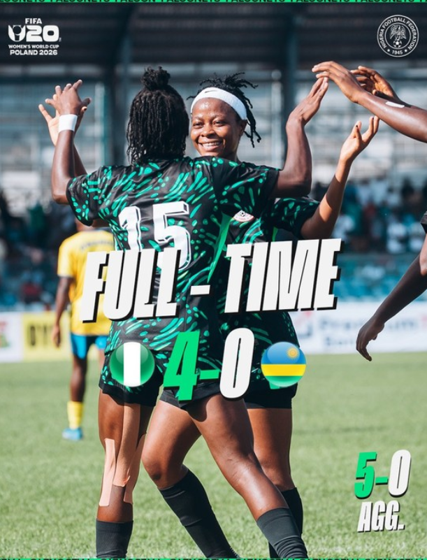 Nigeria’s U-20 girls, the Falconets, thrashed their visitors, She-Amavubi of Rwanda, 4–0 in a 2026 FIFA U-20 Women’s World Cup second round, second leg qualifying match in Ibadan.