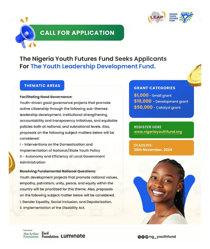 Are you a young changemaker looking for funding to support your community projects? The Nigeria Youth Futures Fund (NYFF) is now accepting applications for the 2024/2025 grant cycle, designed to empower young leaders in Nigeria working on community change.