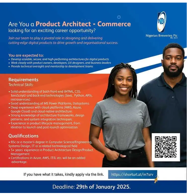Nigerian Breweries is seeking a Product Architect – Commerce to join the Digital Products & Transformation team. This role involves designing and delivering scalable digital products that support the organisation’s commercial functions.