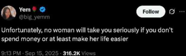 In a post on her official X (formerly Twitter) handle, a lady identified as @Big_yemm boldly stated that women will not take men seriously if they do not spend money on them.