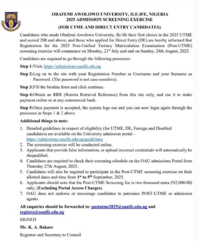 • Candidates who selected OAU as first choice in the 2025 UTME and scored 200 or above.