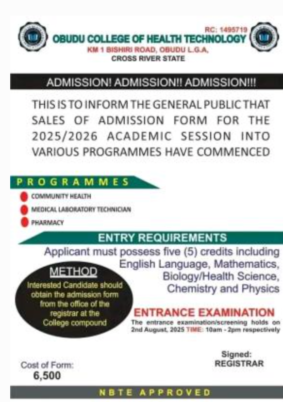 The management of Obudu College of Health Technology, Cross River State, invites applications from suitably qualified candidates for admission into its academic programmes for the 2025/2026 session.