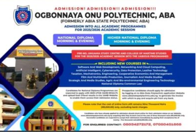 Applications are hereby invited from suitably qualified candidates for admission into the ND and HND Programmes of the Ogbonnaya Onu Polytechnic, Aba (formerly Abia State Polytechnic) for the 2025/2026 Academic Session.