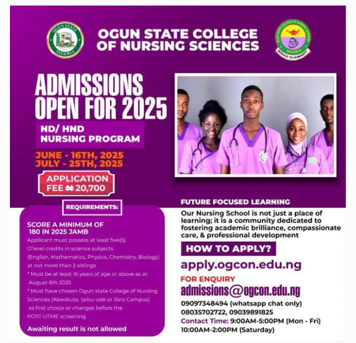 The Ogun State College of Nursing Sciences is now accepting applications for admission into its ND and HND Nursing programmes for the 2025/2026 academic session. The college has campuses in Abeokuta, Ijebu-Ode, and Ilaro.