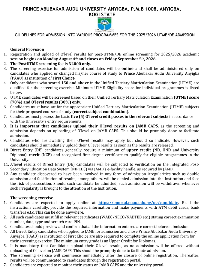 Prince Abubakar Audu University, Anyigba (PAAU), formerly known as Kogi State University, has announced the commencement of Post-UTME and Direct Entry (DE) online screening for the 2025/2026 academic session. This online approach is to reduce the financial burden and risks of traveling for physical screening.