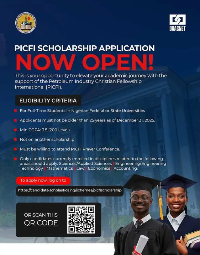 The Petroleum Industry Christian Fellowship International (PICFI) is offering scholarships to 200-level students in Nigerian public universities. If you're studying science, engineering, law, or accounting and you meet the requirements, you can apply.