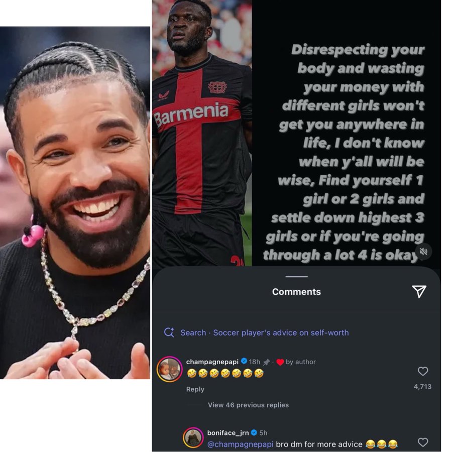 Rapper Drake reacts to Victor Boniface’s viral advice to men and the footballer replies