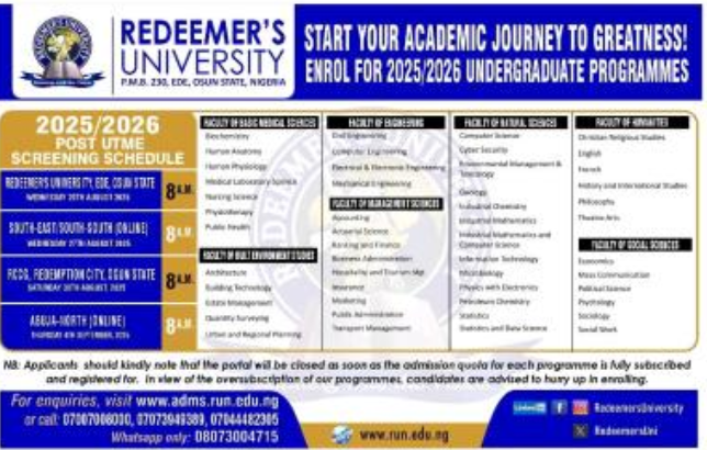 Redeemer’s University, Ede, Osun State invites applications from qualified candidates for admission into its undergraduate programmes for the 2025/2026 academic session.